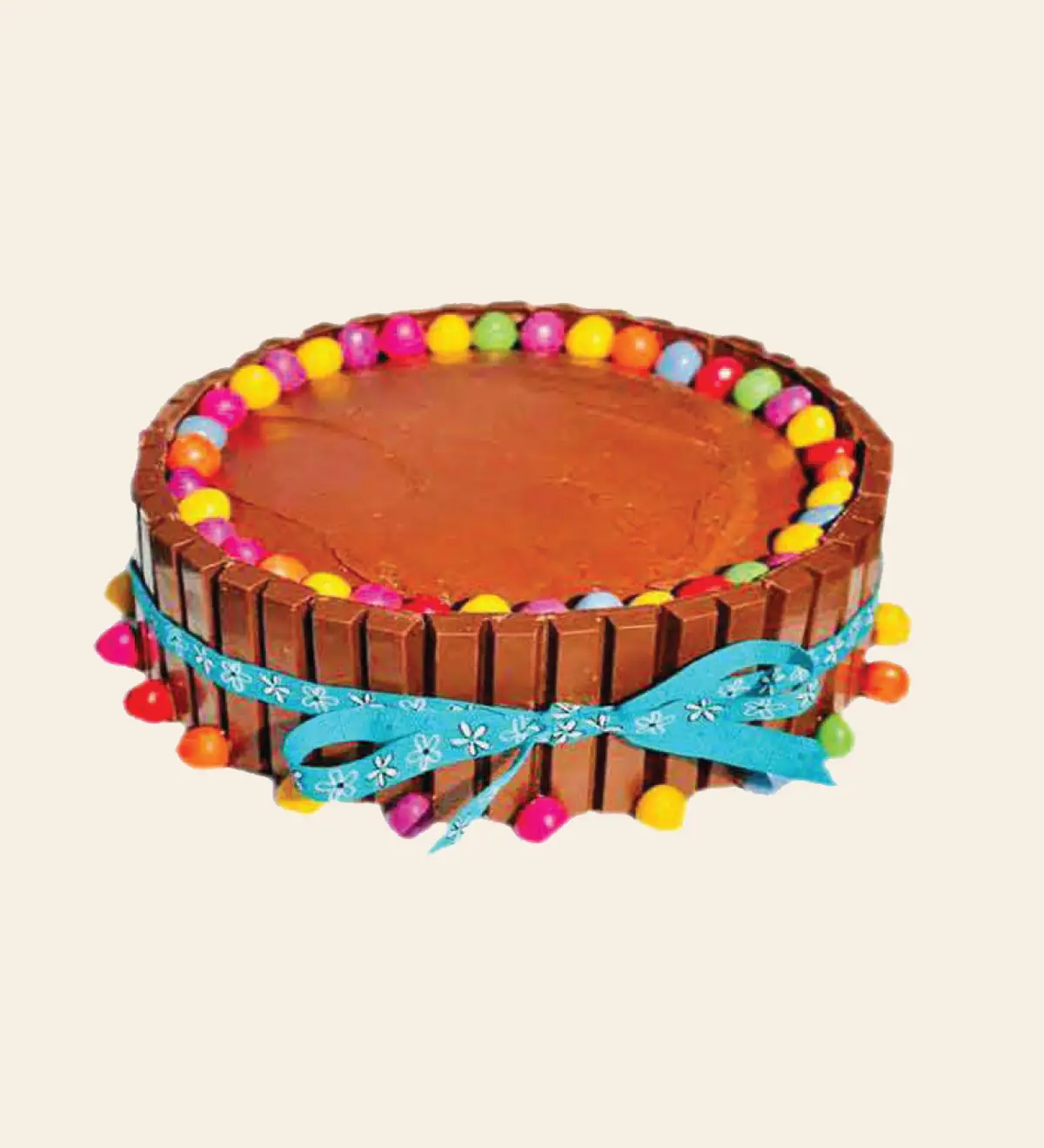 Chocolate sponge Cake layered with dark chocokate ganache and chopped kitkat as fillings top decorated with ganache, gems, garnishes and vertically kitkat candy bars all the way around the cake wrapped with a ribbon